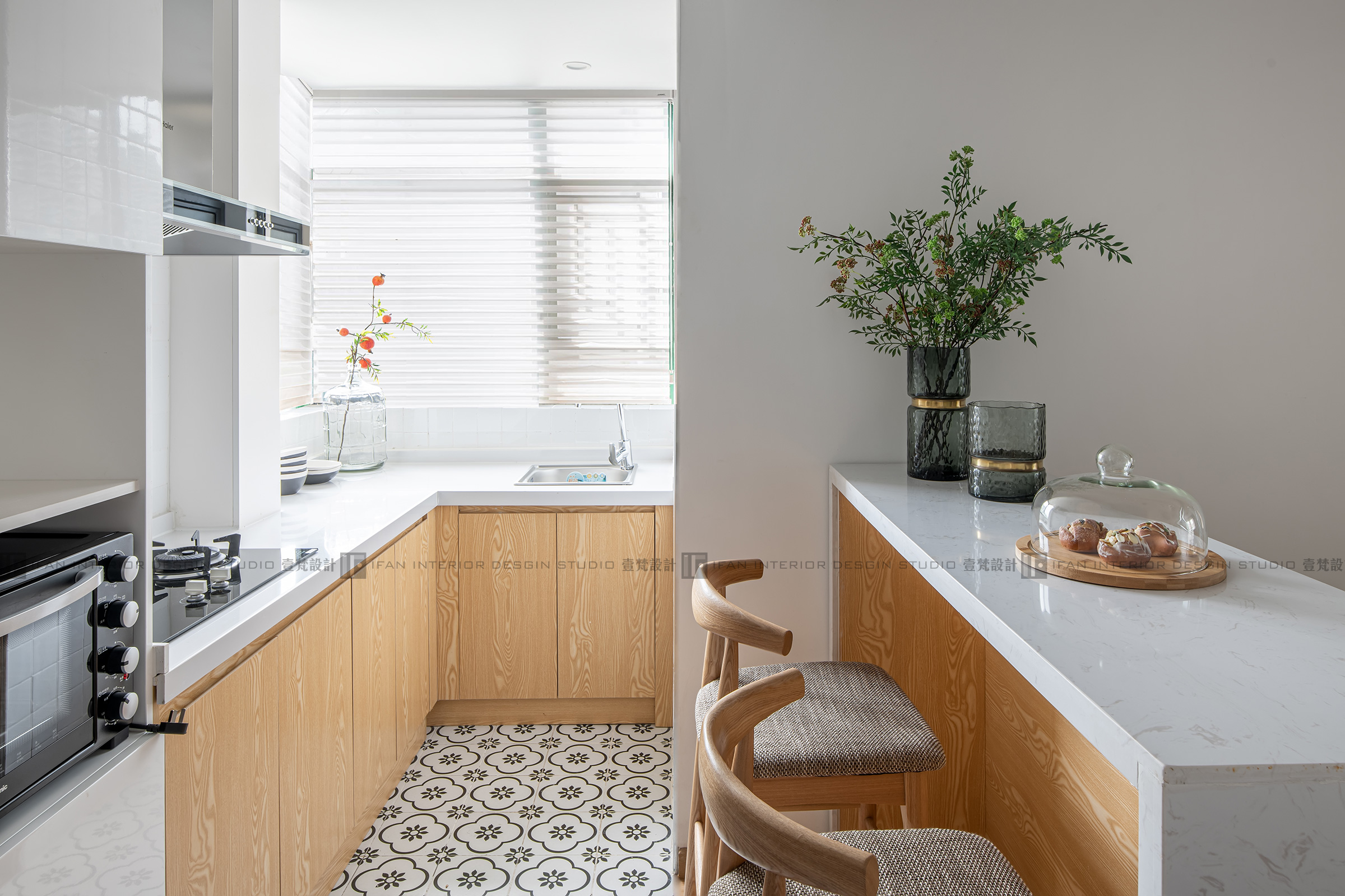 白色与原木色的搭配,餐厨空间干净明亮,清新自然;复古的黑白花砖别具一格,可爱又有情调,这里不单是烹饪美食,更是烹饪幸福生活。