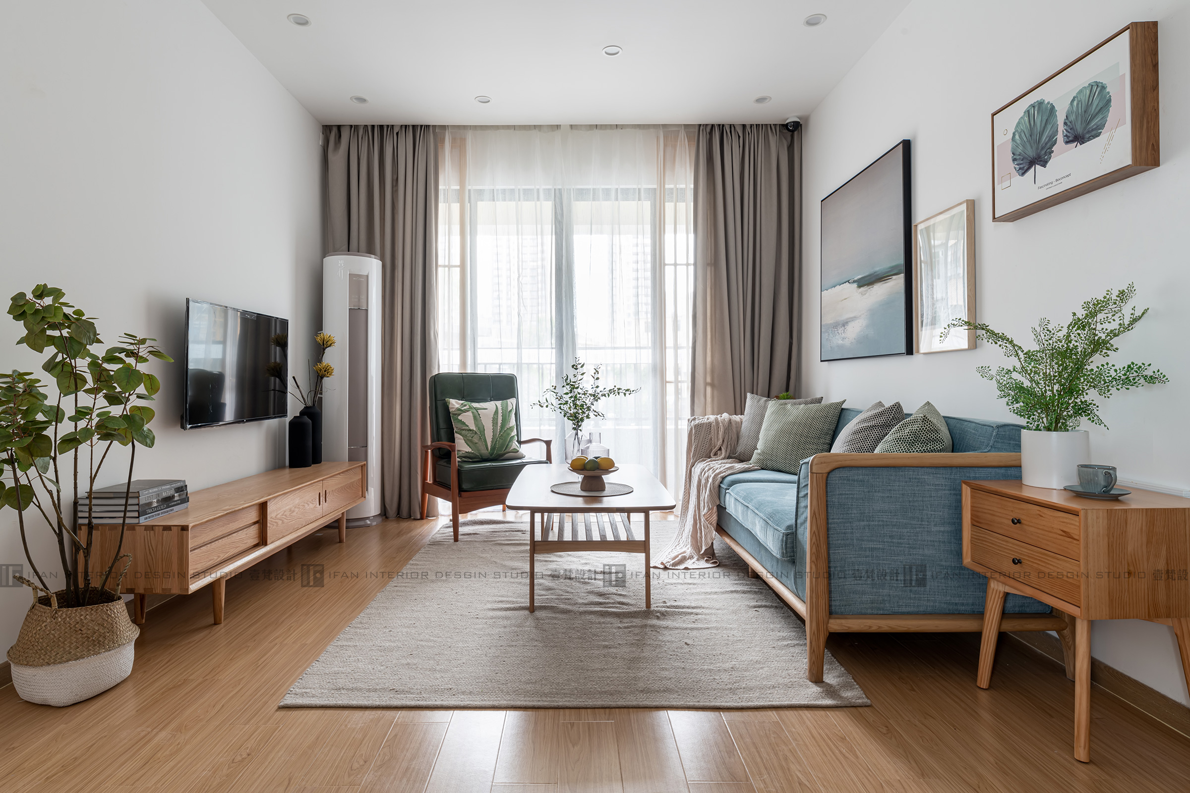 通过洁净的白色与自然木色相结合,整体空间温润轻盈;布艺的蓝色沙发与同色系的海浪油画,不论从哪个角度看,都有“目光所及都是温柔”的感受;绿油油的植物,以生命的方式存在还是绘制在布艺上,都散发着生机勃勃的气息,让人舒适轻松。