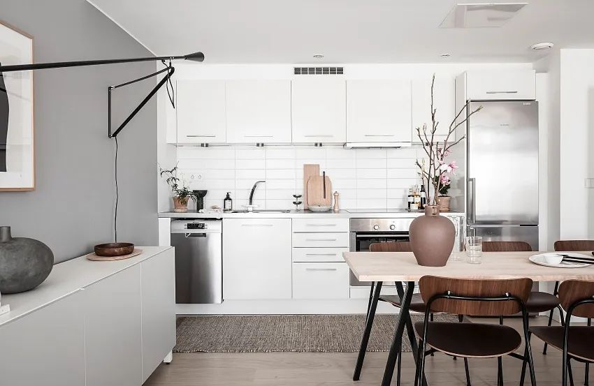 餐厨区以实木餐桌、吊顶层高变化分隔,白色简约定制柜,嵌入不锈钢面板的家电,整洁又明亮。